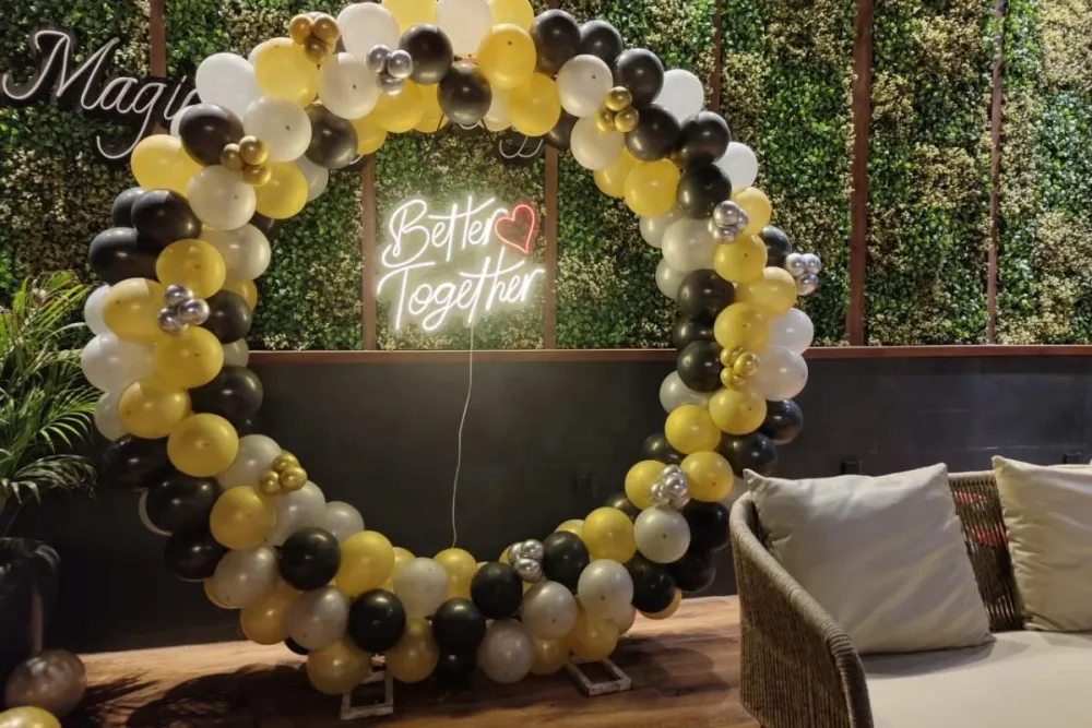 Better Together ring decoration setup with balloons and lights by AA Decorator Chandigarh theme features a large decorative metal ring beautifully adorned with balloons, flowers, fairy lights, and “Better Together” LED signage, symbolizing unity, love, and togetherness. Whether you’re celebrating an anniversary, engagement, or a romantic surprise, this décor creates a magical atmosphere perfect for photos and memories.